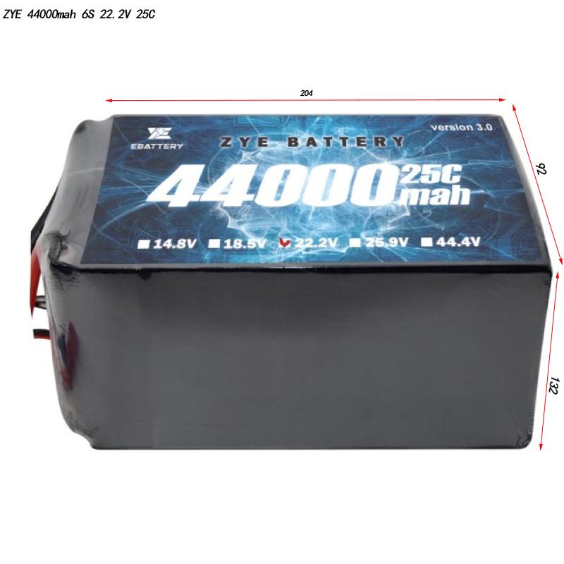 | 44000mAh | 6S1P (22.2V) | 4990g (± 10g) | 204*92*132mm | 976.8Wh | 25c 1100A | 50C 2200A |